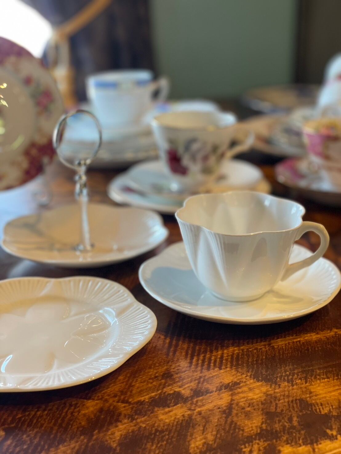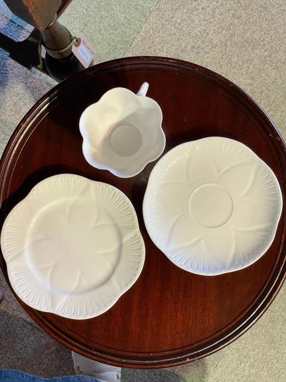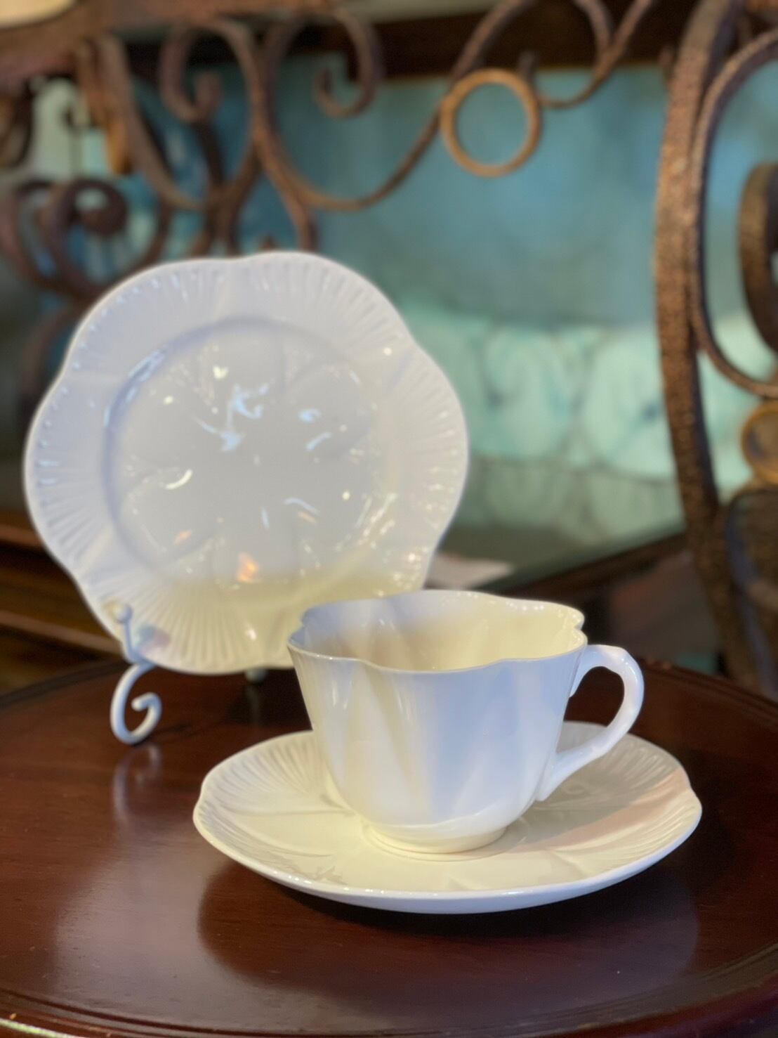 カップやプレートの花びらのような形状や縁に施された繊細な装飾が、清楚な雰囲気で可愛らしいです。