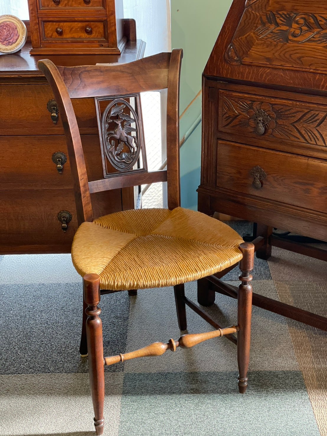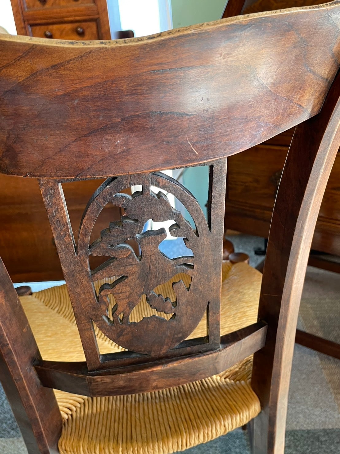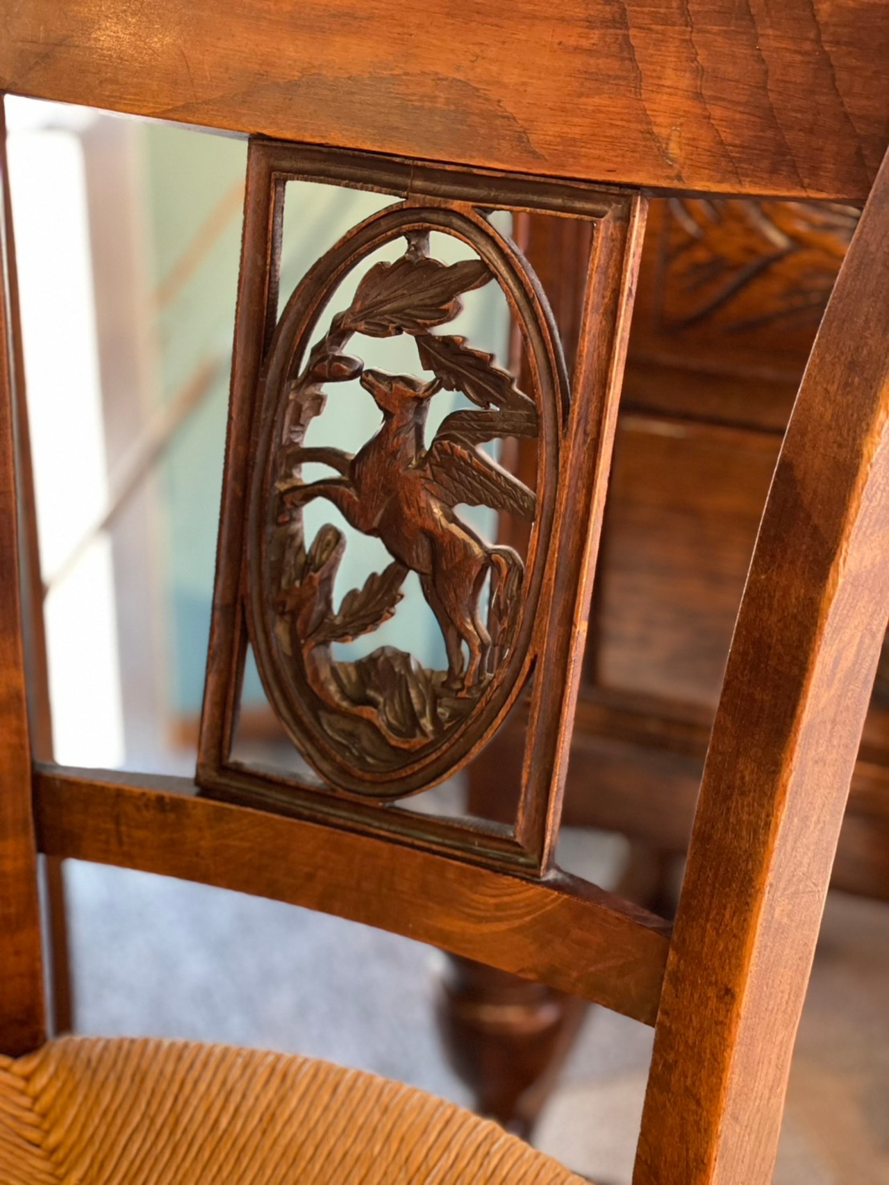 背もたれには羽根つきの馬、ペガサスでしょうか?この手彫りの彫刻がとても素敵です。