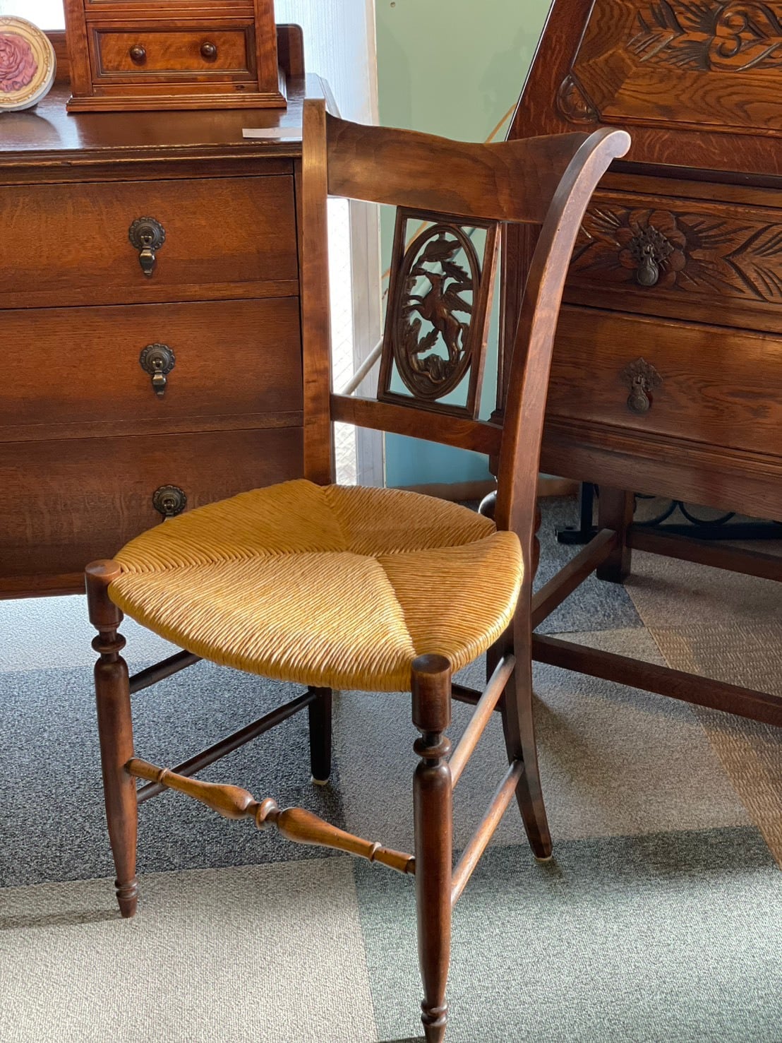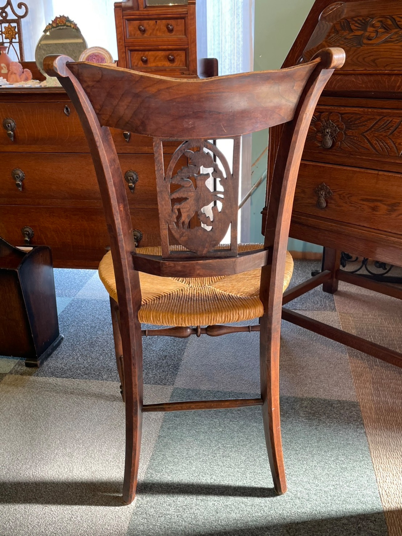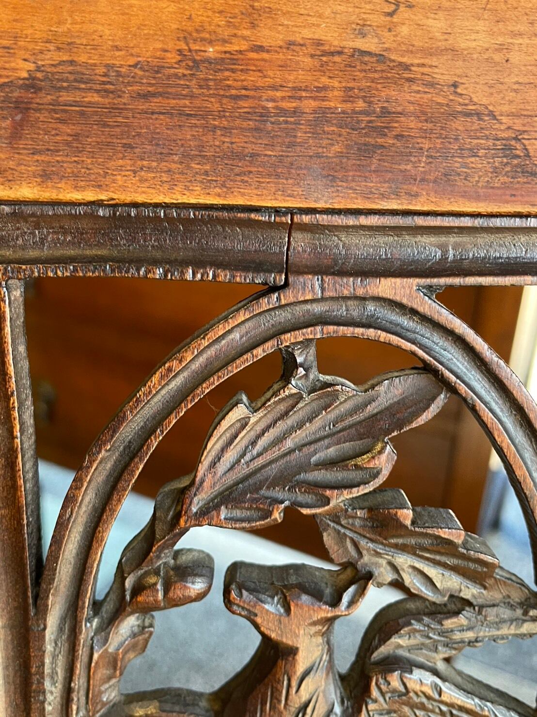 背もたれには羽根つきの馬、ペガサスでしょうか?この手彫りの彫刻がとても素敵です。