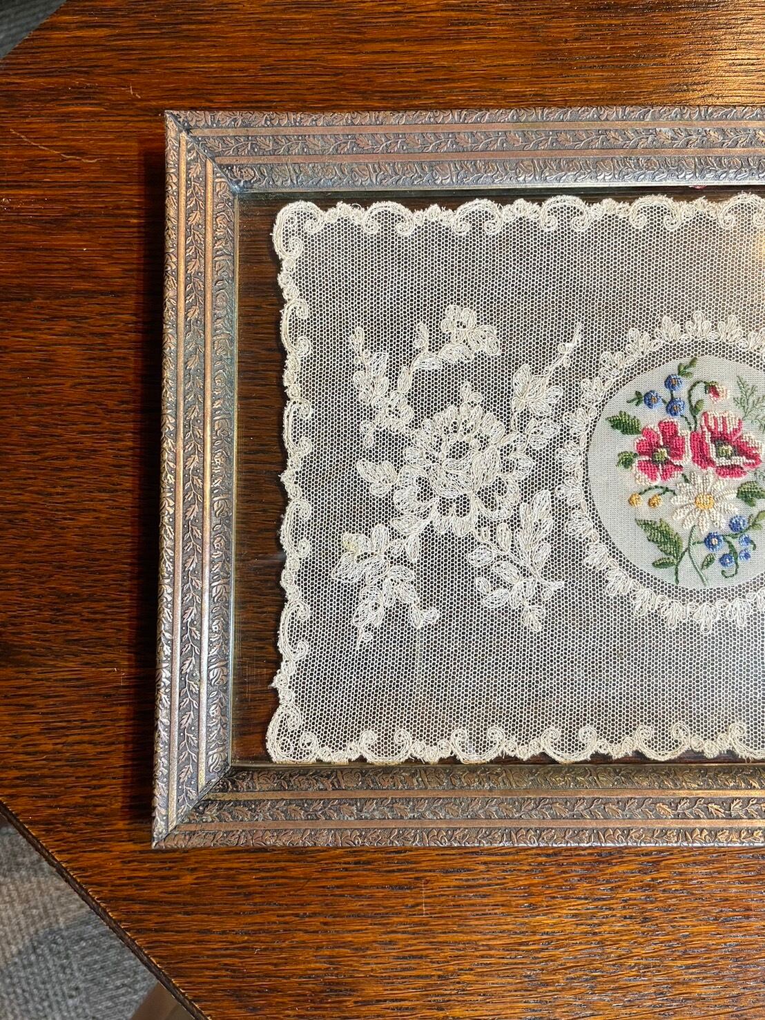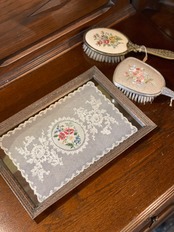 合わせガラスの中に、美しく繊細なレースとプチポワン刺繍が入ったガラスのトレー。